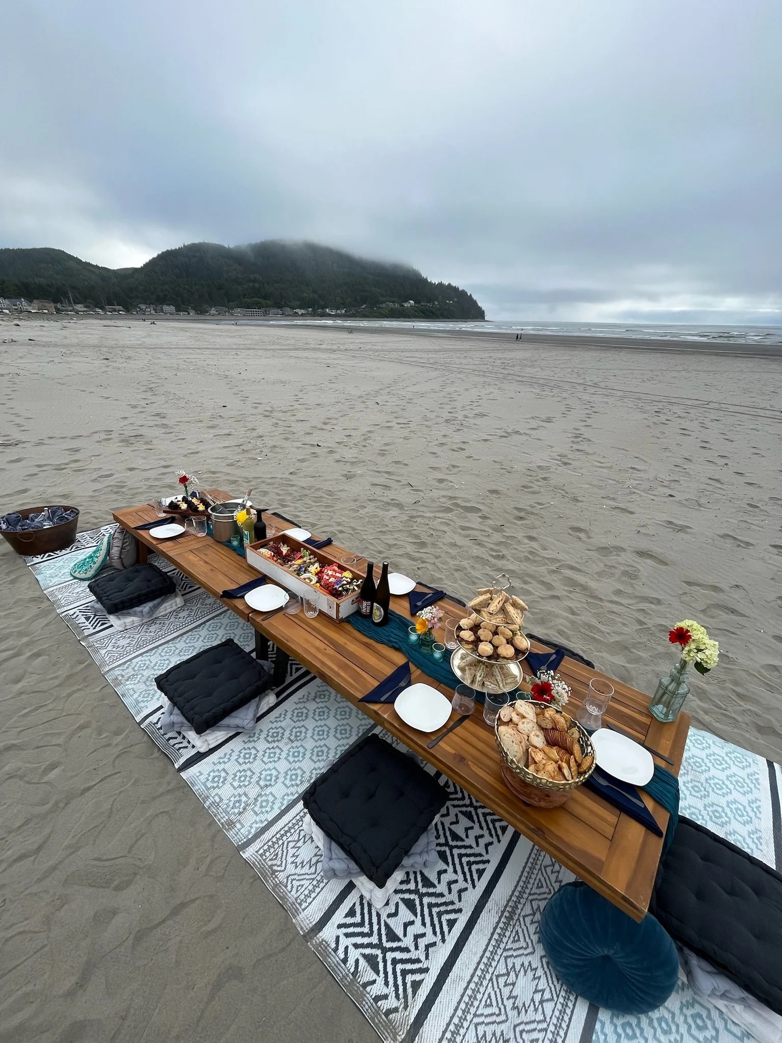 High-end styled beach bonfire set up with our Luxury Bonfire Package.